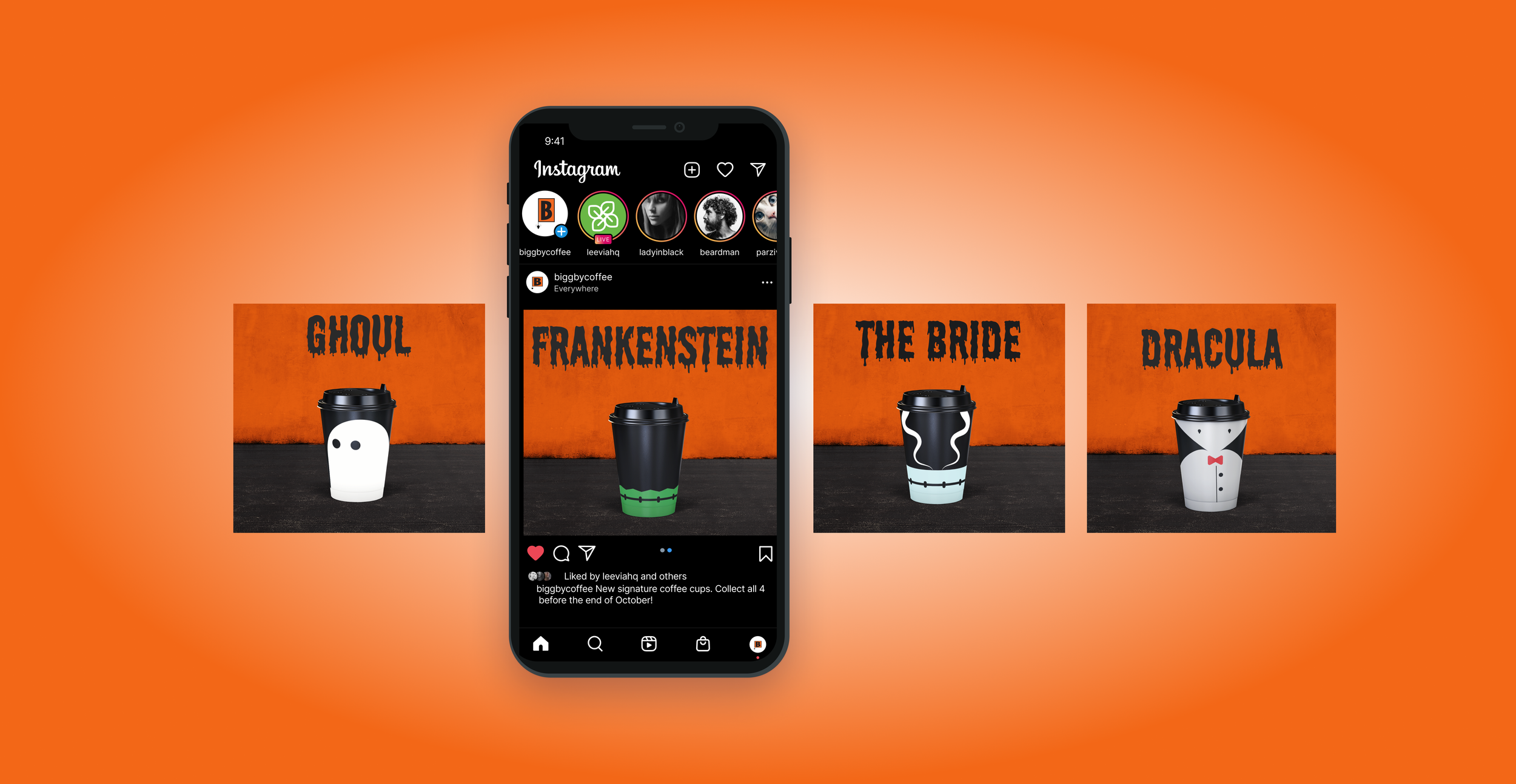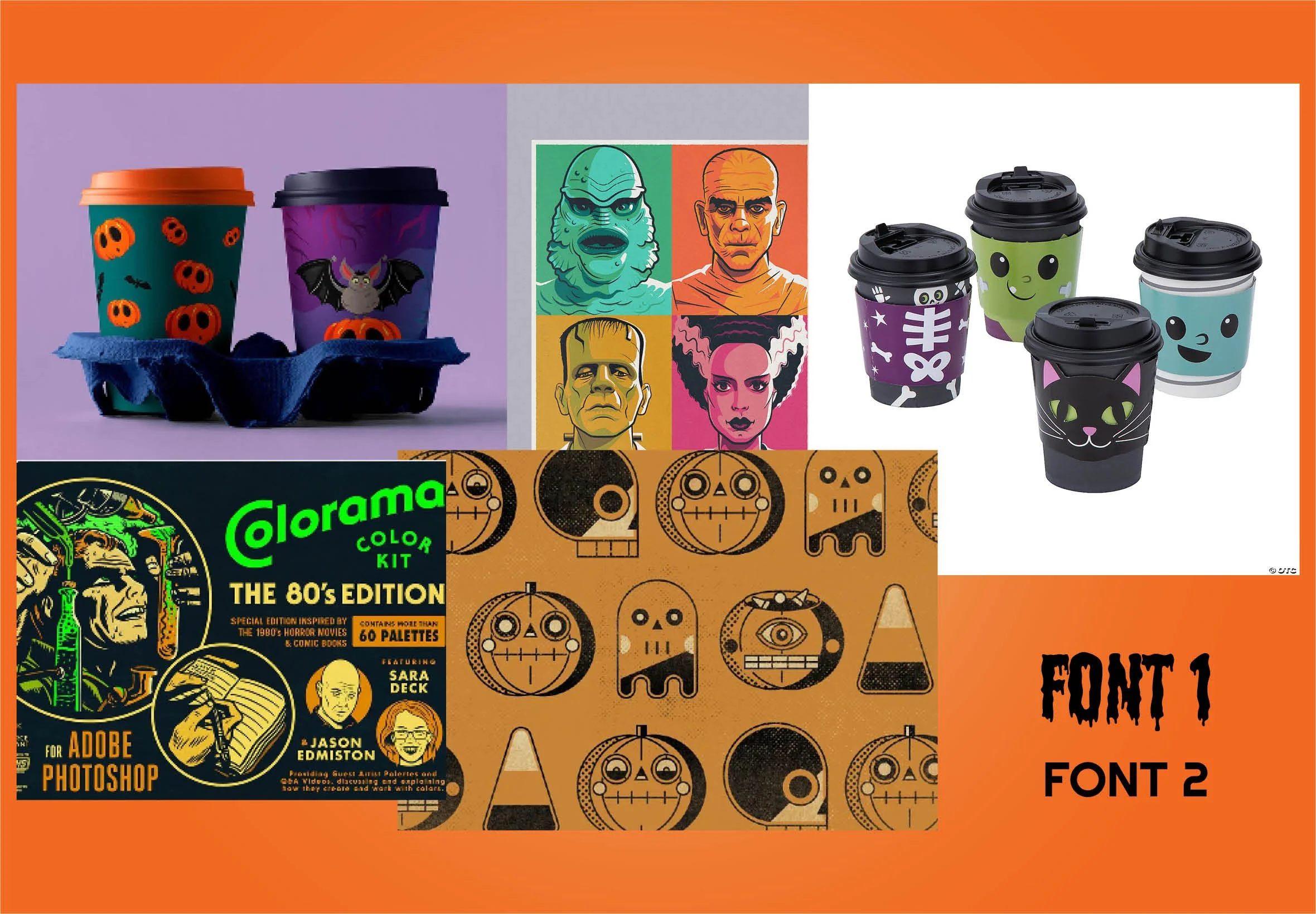 Currently, Biggby Coffee does not have an established system for seasonal branding. There are a few pieces of specialty merchandise available for this purpose, but not a regular design. This design consists of shapes depicting classic Halloween characters: Frankenstein’s Monster, The Bride of Frankenstein, Dracula, and a ghost. Classic horror style type, as well as other bits of Halloween iconography, will tie the system together. Collectible cups will drive consumer interest as well as provide merchandising consistency.